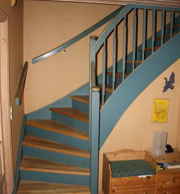 Klassisk tretrapp med solide, dreide spiler og kraftig håndrekke.